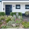 Von März bis Oktober reichen sich in diesem Ensemble die Pflanzen den Blüten-Staffelstab weiter, so dass es über Monate etwas Schönes zu betrachten gibt. Von Kugelprimeln über Teppich-Flammenblume und Kaukasusvergissmeinnicht bis hin zu Günsel und Pfingstveilchen reicht das Blütenangebot im Frühling. Beeindruckend auch das Tränende Herzen Ende April! Zur Rose im Juni gesellen sich dann zweierlei Storchschnäbel sowie Glockenblumen. Duftender Phlox verleiht dem Beet im Hochsommer ländlichen Charme und ist eine gern besuchte Nektarquelle für Schmetterlinge. Das Gartenjahr beschließen Herbst-Eisenhüte, die mit wundervollem Königsblau über dem Beet thronen. Doch der Schmuckwert des Beetes endet hier noch lange nicht, denn einige immergrüne Pflanzen wie weinrotes Purpurglöckchen und eine weißbunte Japansegge bieten selbst in der kalten Jahreszeit noch attraktive Blickfänge.