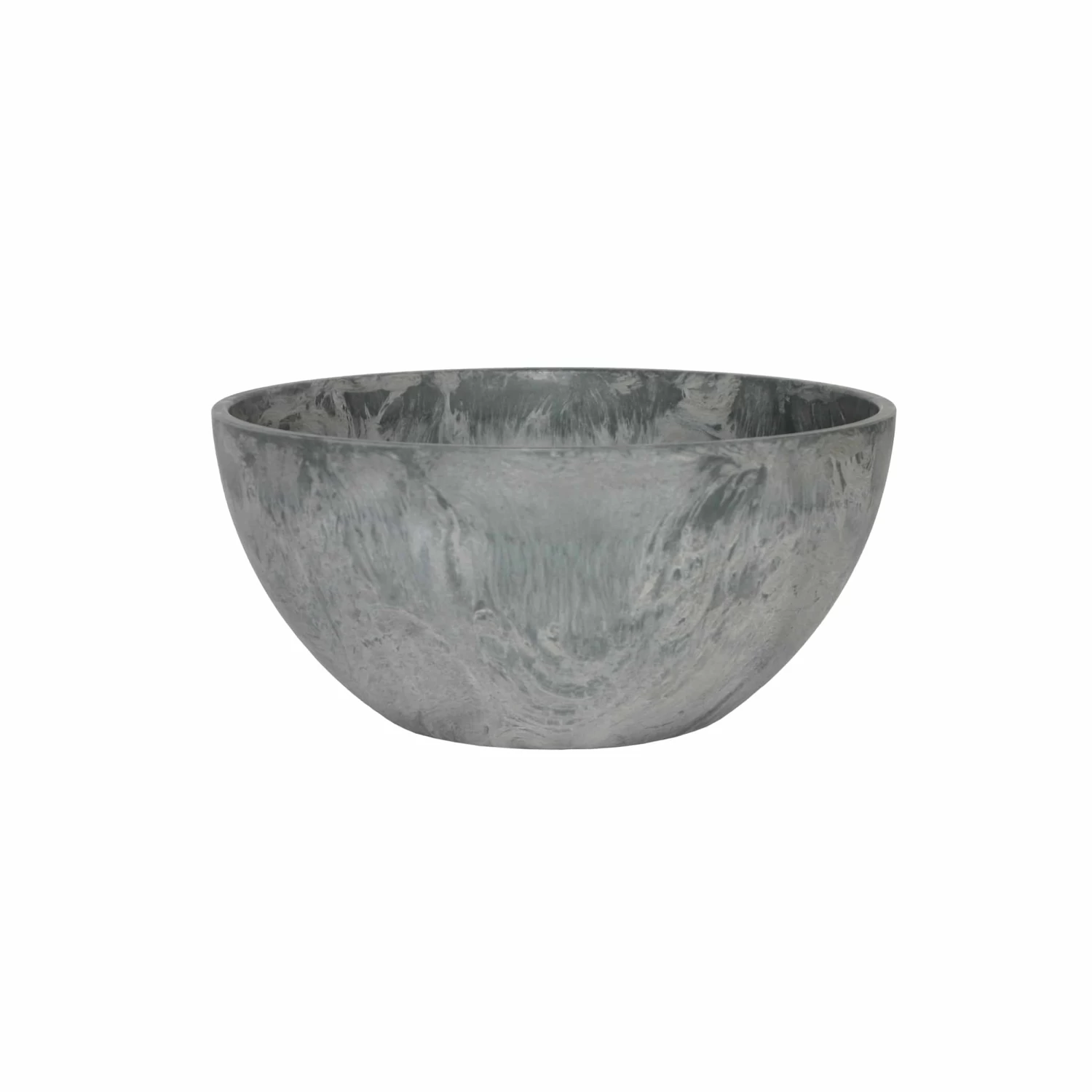 Das Ausgangsmaterial der Blumenschale besteht aus einem Gemisch aus Resinharz (Gießharz) und recyceltem Kunststoff. Um die Kunstmarmor-Optik zu erhalten ist dem Basismaterial Natursteinpulver beigemischt. Hierdurch entsteht das einzigartige Aussehen des Pflanzgefäßes.