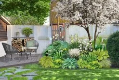 Lassen Sie sich verzaubern von einem Reigen erlesener Wald- und Gehölzrandstauden wie dem zarten Tränenden Herz, imposanten Schaublatt, weißem Eisenhut und leuchtendem Straußenfarn. Von Frühjahr bis Herbst erfreut dieses Beet mit Blüten von unterschiedlichster Form. Auch im Winter bleiben Ihnen das immergrüne japanische Goldberggras, Hirschzungenfarn, Heuchera und das polsterbildende Sternmoos erhalten und bringen die nötige Farbe in eine eher triste Jahreszeit.