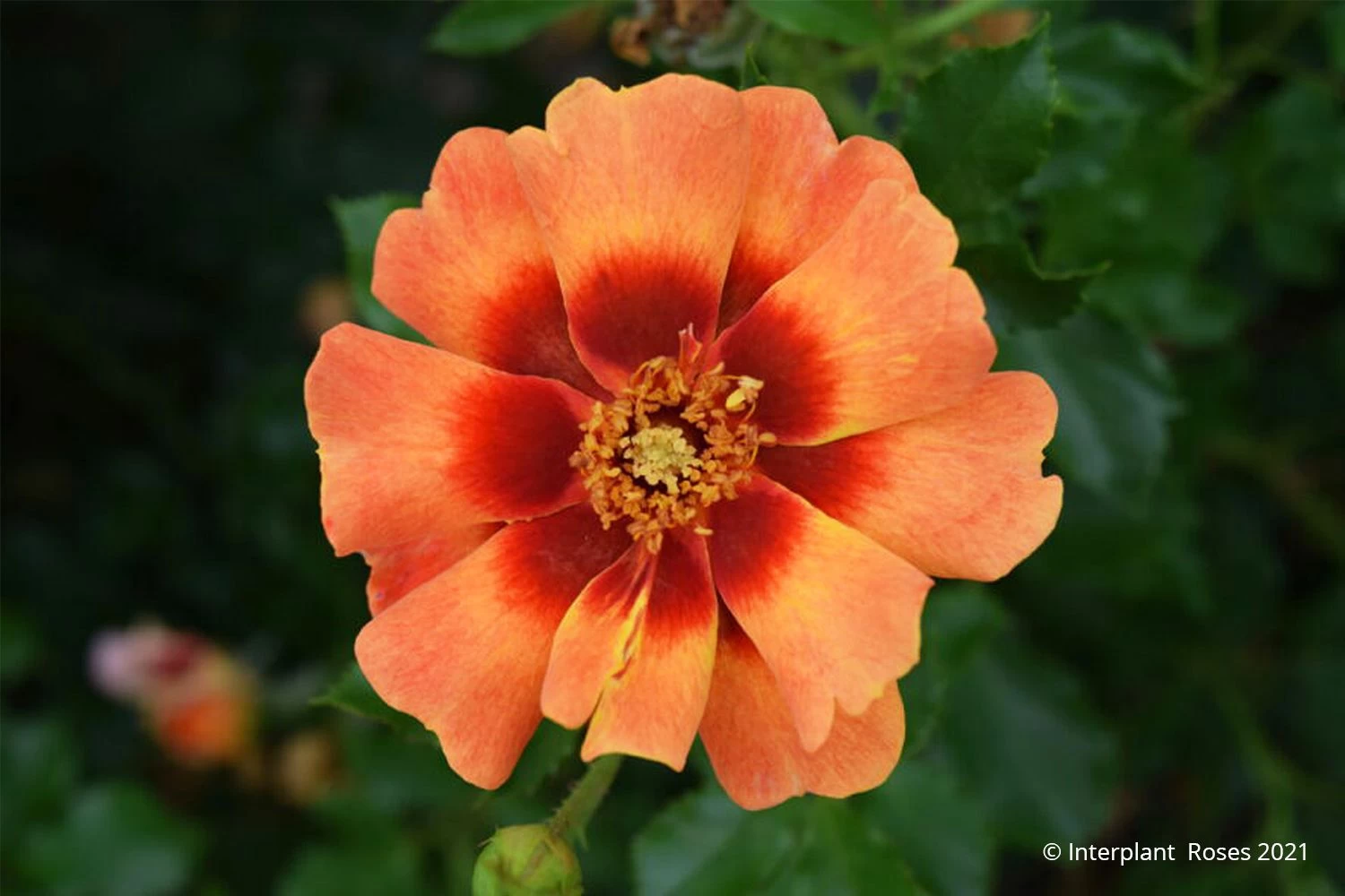 Persica-Rosen, zu denen auch die Rose ‚Flame Babylon Eyes‘ ® zählt, zeichnen sich durch offene Blütenschalen aus, die von einem dunklen „Auge“ gezeichnet sind. Durch die einfachen Blüten bieten sie Insekten wertvollen Nektar. ‚Flame Babylon Eyes‘ ® besticht in dieser Rosengruppe mit tief kupferorangen Blüten, deren Mitte ein weinrotes Mal ziert.