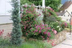 Eine Rose, die durch ihre besondere Farbe überzeugt: Violett-purpur, das z. B. perfekt zu unserem Trendbeet in der Farbkombination „Mauve und Silber“ passt. Die halbgefüllten Blütchen erscheinen in großen Rispen, sie blüht gut nach und bildet im Spätsommer enzückende kleine Hagebutten, die sich auch gut in der Floristik einsetzen lassen.