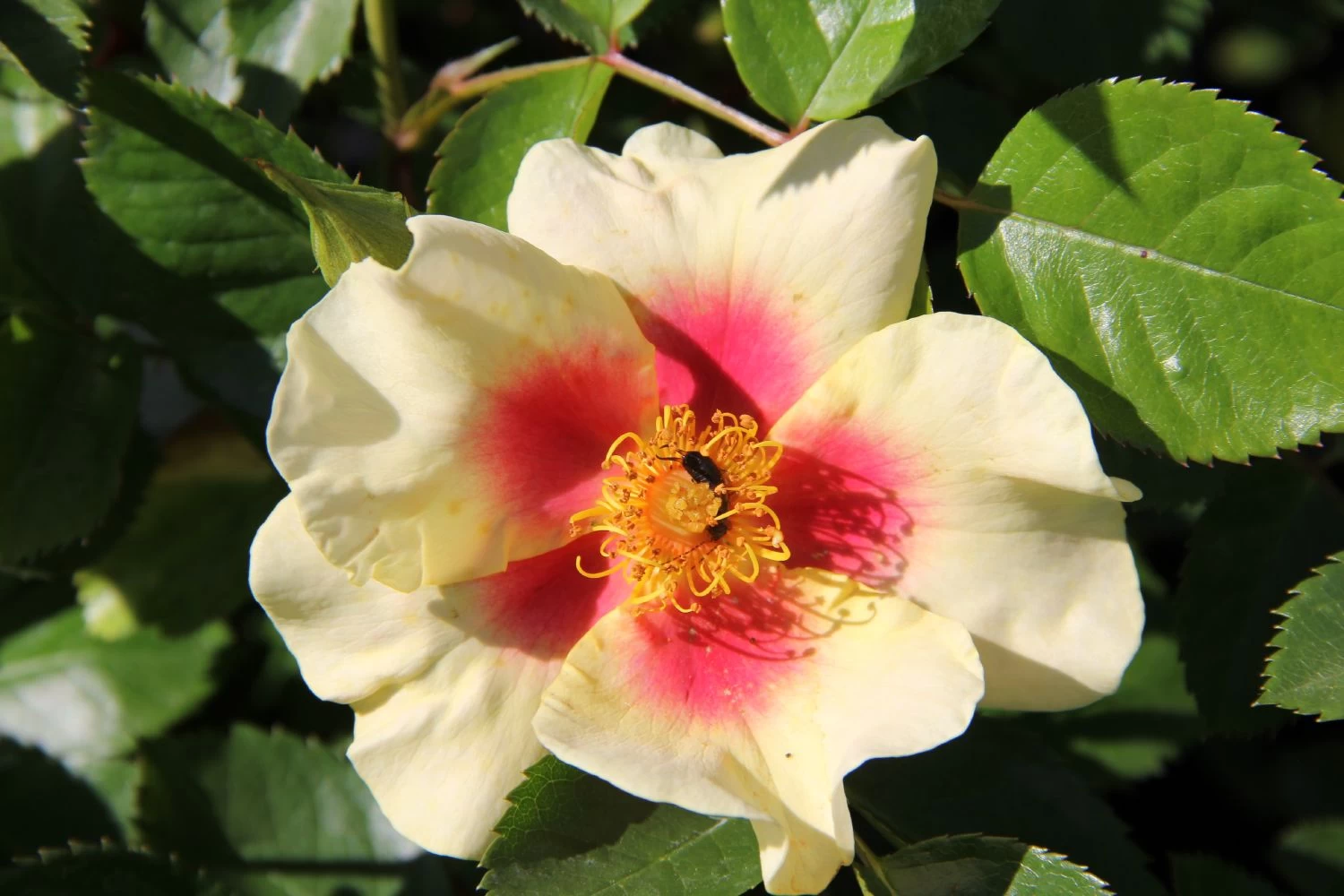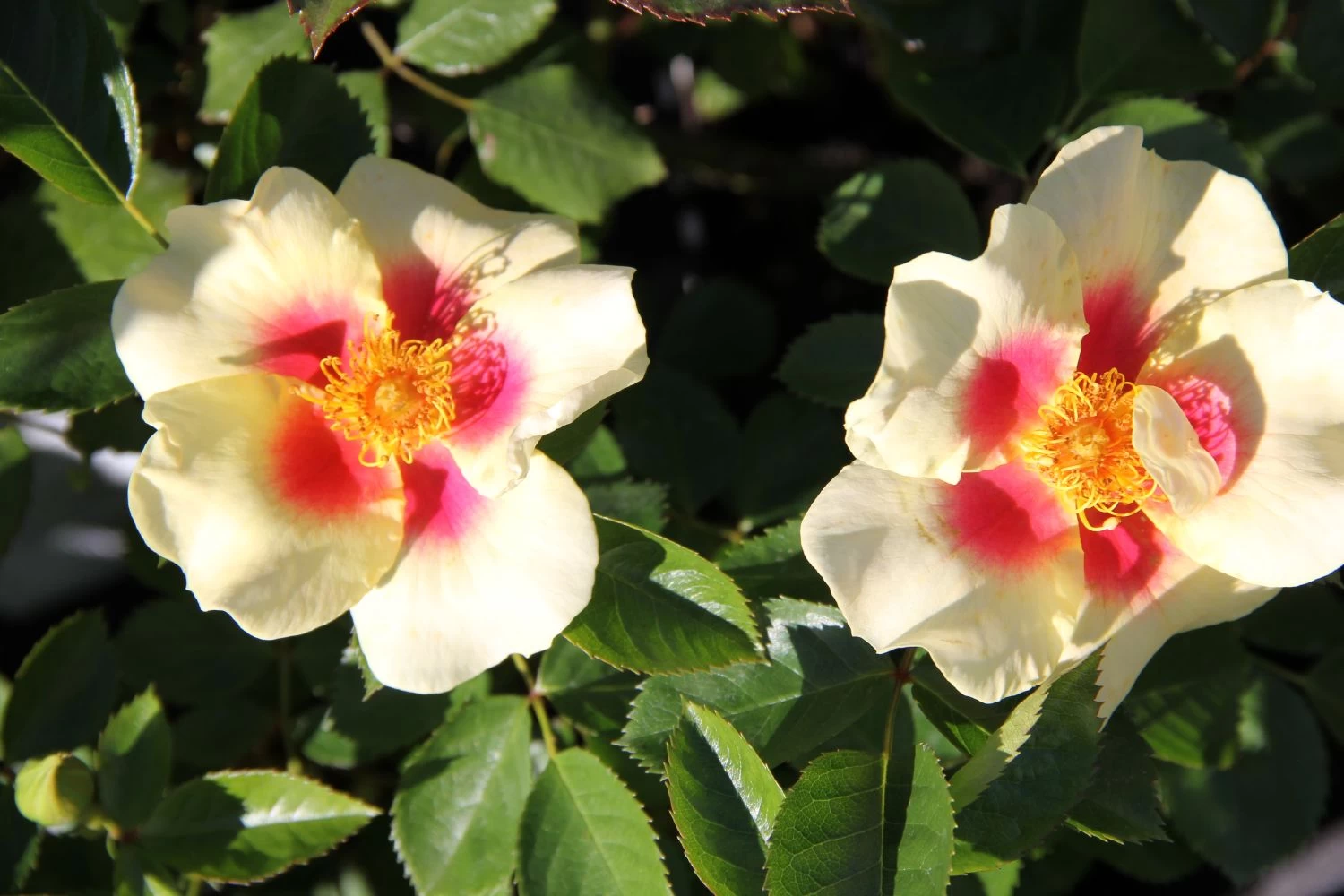 Die Rose ‚Queen of Sheba‘ ist eine Persica Hybride. Diese Beetrose besitzt einfache Blüten in gelb mit rotem Auge. Sie ist sehr reichblühend. Der Wuchs von’Queen of Sheba‘ ist buschig aufrecht mit robustem Blattwerk.