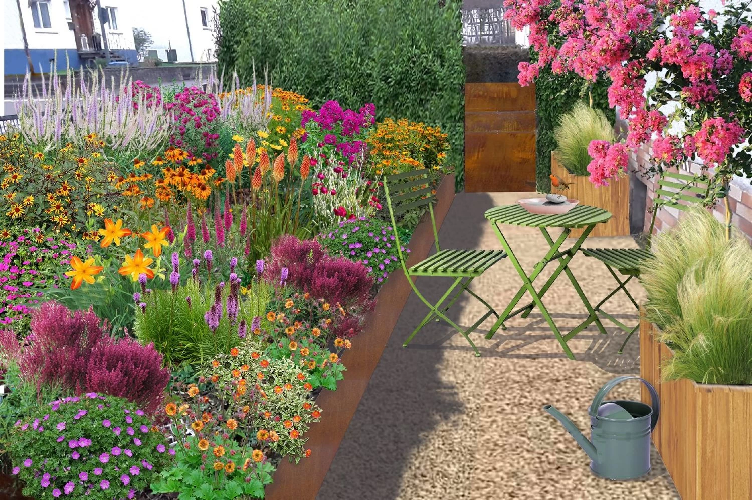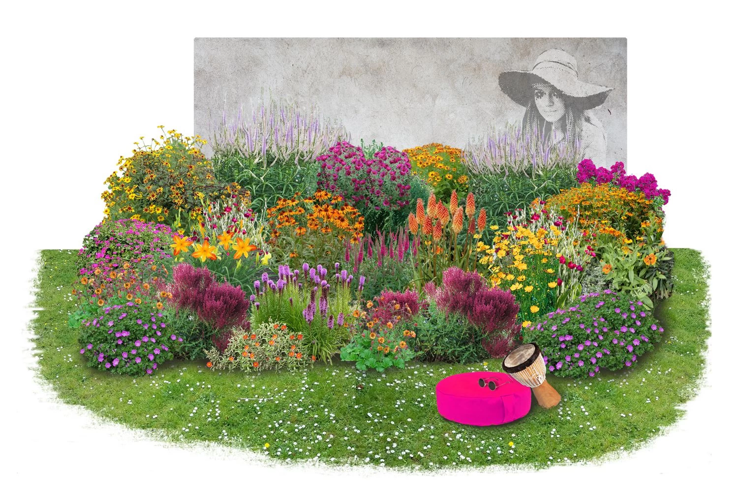 Genießen Sie Ihr ganz persönliches Blütenmeer aus farbenfrohen Sonnenbräuten, purpurnen Storchschnäbeln, orangenen Sonnenhüten, Flammenblume, Taglilie, Fackellilie, Prachtscharten, Ziersalbei und vielen mehr. Ganz nebenbei dient die Pflanzenauswahl in diesem Beet auch als ideale Bienen- und Schmetterlingsweide.