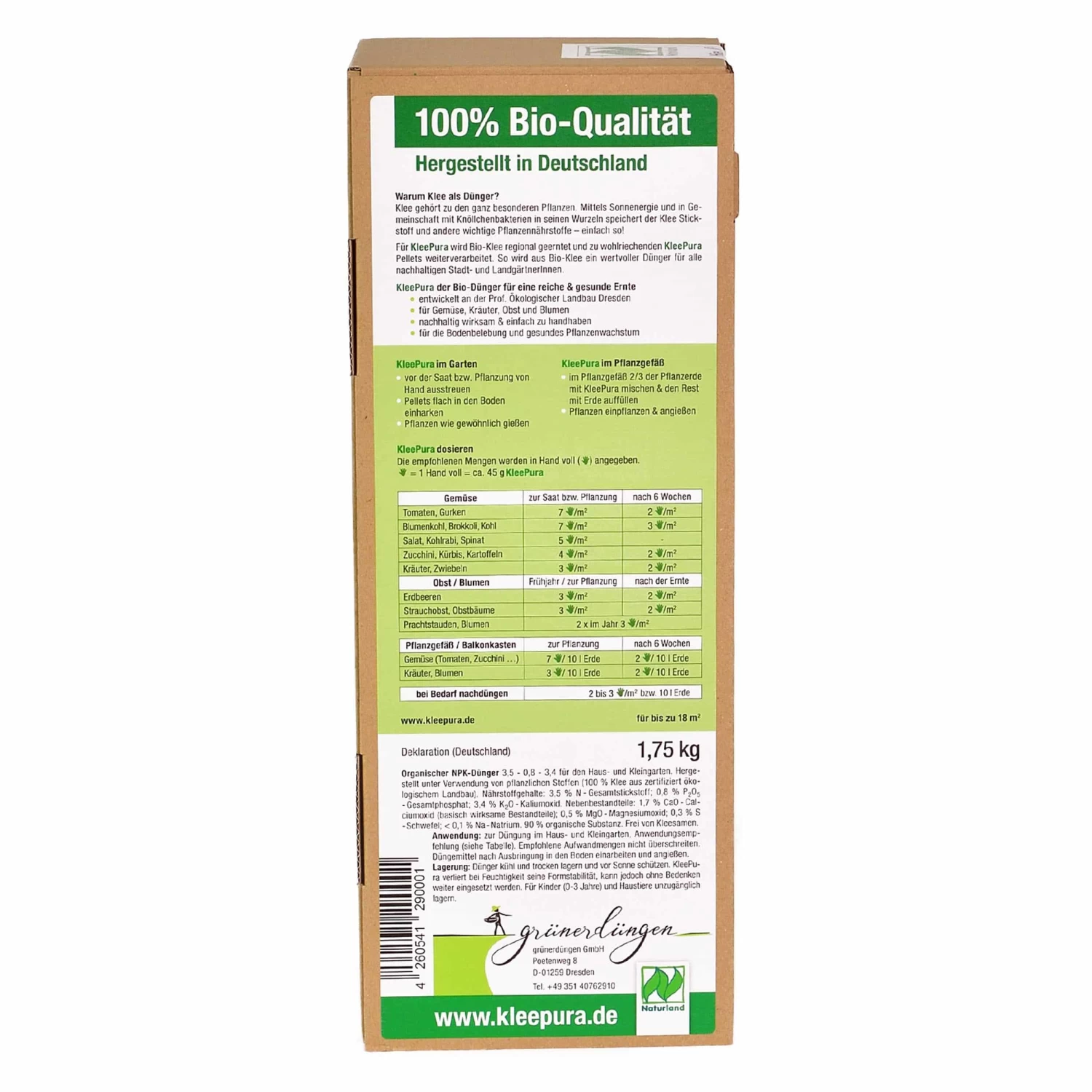 KleePura ist der erste zertifizierte Bio-Dünger für Balkon & Garten aus 100 % Bio-Zutaten. KleePura ist rein pflanzlich (vegan) und enthält keine Abfälle der Massentierhaltung sowie konventionellen Lebensmittelindustrie. Mit KleePura Bio-Dünger in Naturland Qualität können Gartenanfänger und Profis gleichermaßen erfolgreich durch und durch nachhaltig & ökologisch Gärtnern und reichhaltig, geschmackvoll & gesund Ernten. KleePura wird aus 100 % Bio-Klee in Deutschland hergestellt und enthält alle Nährstoffe sowie Spurenelemente, die Balkon- und Beetpflanzen benötigen.